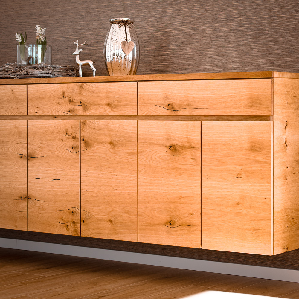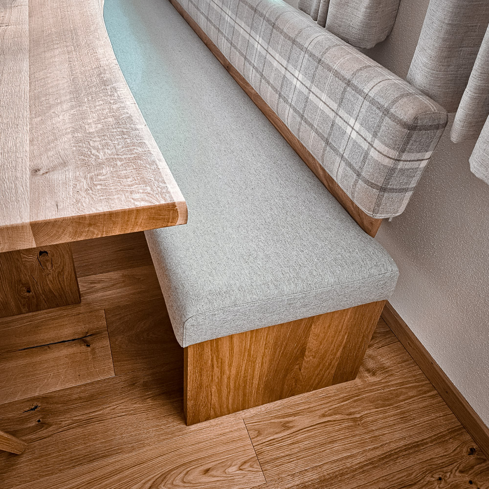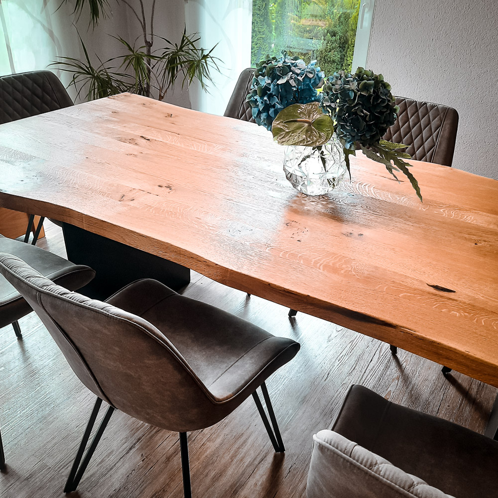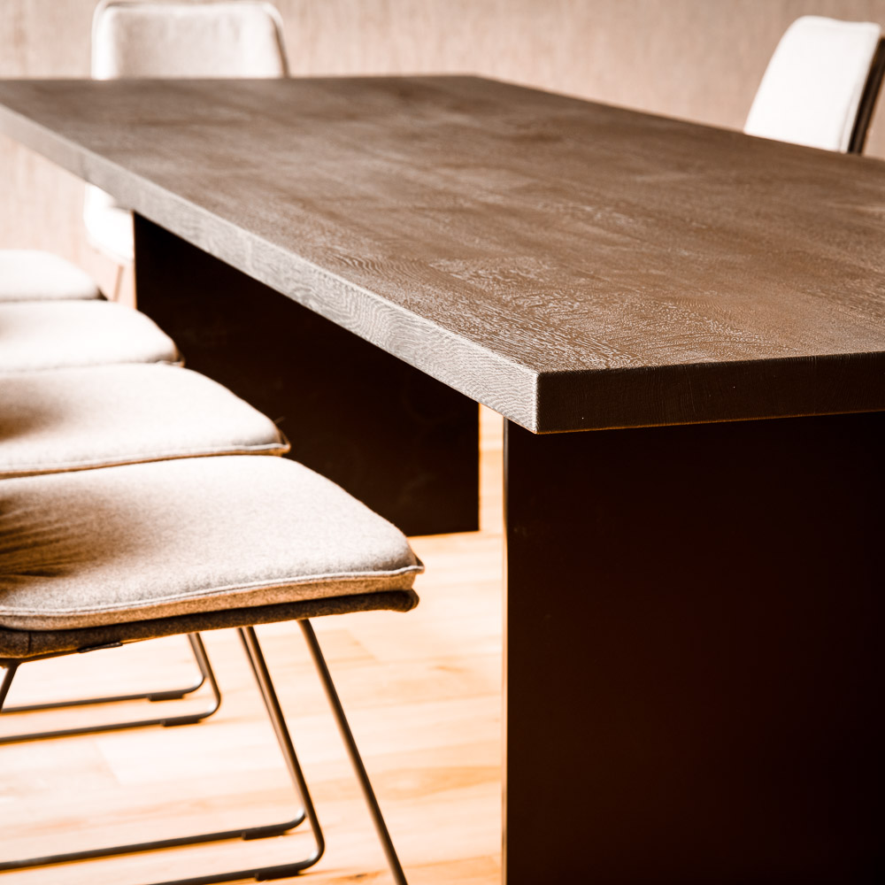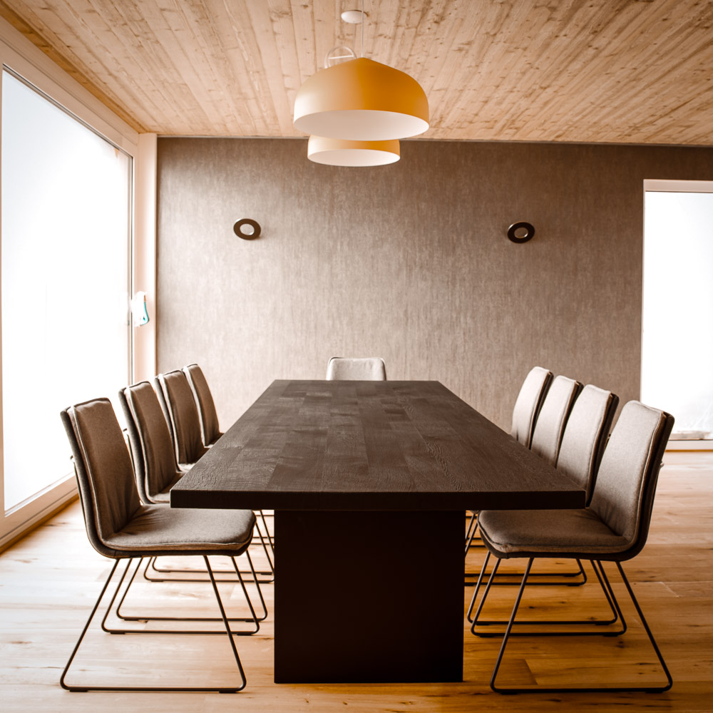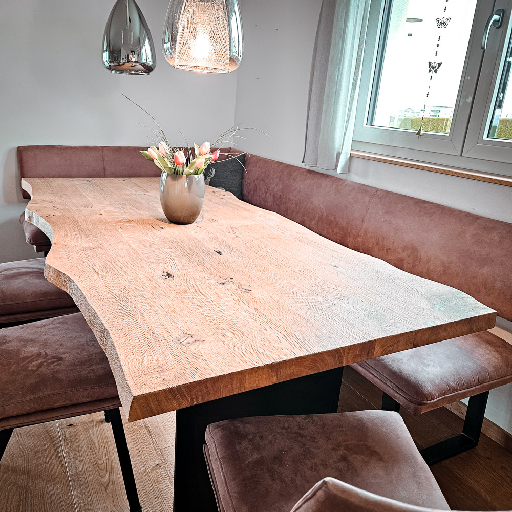 Wir gestalten Esszimmermöbel, die zu Ihrem Raum und Ihrem Leben passen. Ob mit Ansteckplatte oder ohne, Massivholz geölt oder gebürstet, mit Waldkante oder klarer Kante – wir berechnen die optimale Tischgröße für Ihren Grundriss. Tischgestelle als Säulen- oder Wangenfuß, pulverbeschichtet nach Wunschfarbe oder in Edelstahl – jedes Detail wird nach Ihren Vorstellungen umgesetzt.