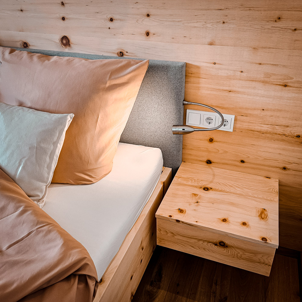 Ob wohl duftendes Zirbenbett, massives Balkenbett aus Eiche oder komplett gepolstertes Bett – nahezu alles ist möglich und wird nach Ihren Wünschen gefertigt. Ergänzt durch passende Bettbänke sowie Nacht­tische aus Holz oder Metall entsteht ein harmonisches Gesamtbild für Ihren persönlichen Rückzugsort.