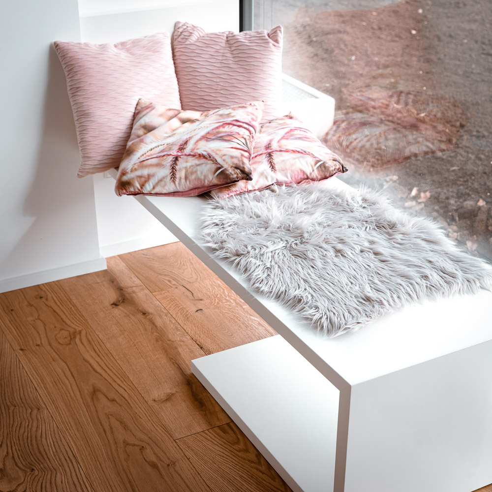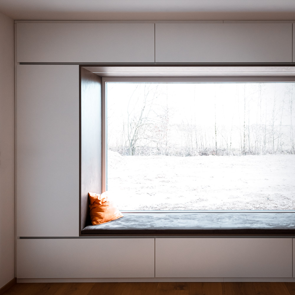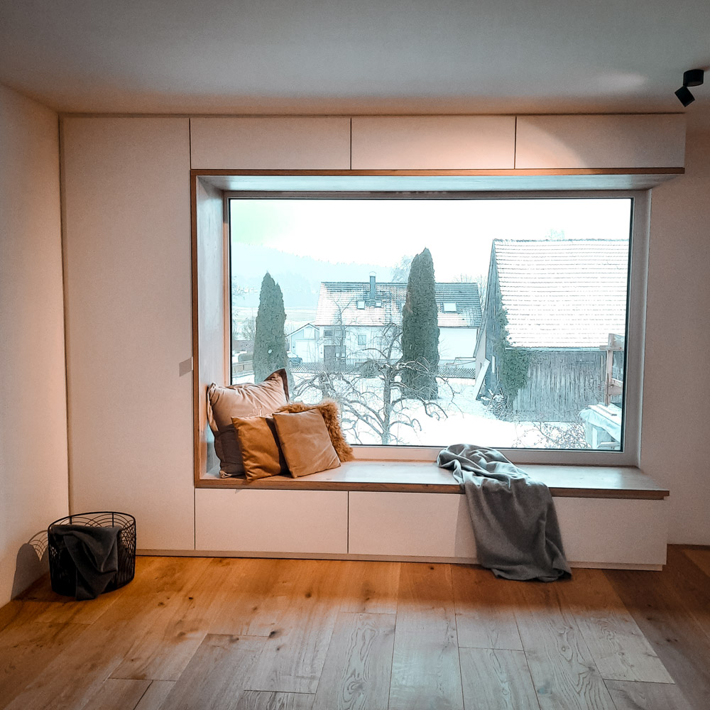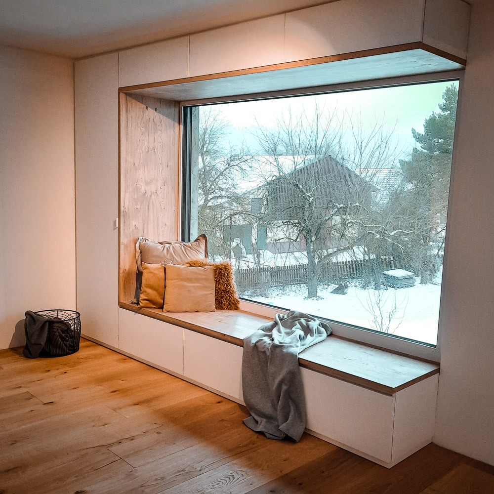 Damit ein Sitzfenster perfekt gelingt, sollte die Sitzhöhe bereits in der Bauphase mit dem Fensterbauer abgestimmt werden. Eine großzügige Laibungstiefe, idealerweise mit Festverglasung, sowie eine Sitztiefe von mindestens 60 cm schaffen die optimale Basis für Komfort und Gestaltungsspielraum.