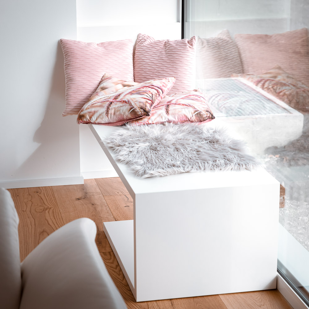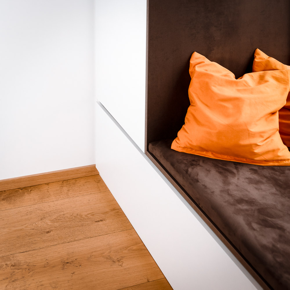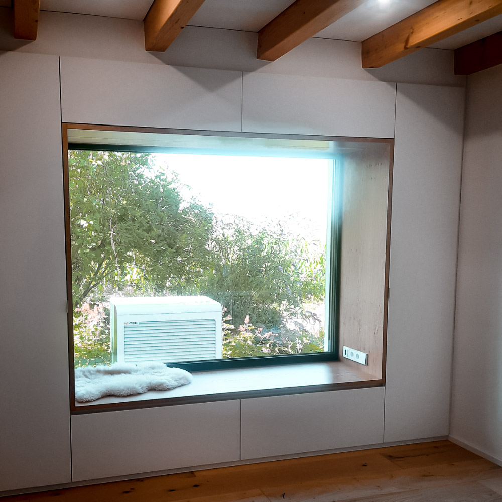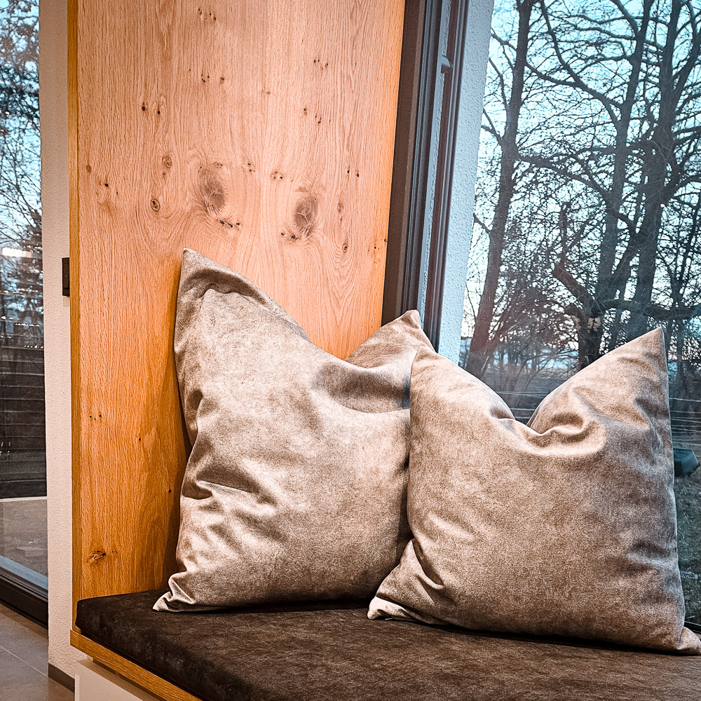 Damit ein Sitzfenster perfekt gelingt, sollte die Sitzhöhe bereits in der Bauphase mit dem Fensterbauer abgestimmt werden. Eine großzügige Laibungstiefe, idealerweise mit Festverglasung, sowie eine Sitztiefe von mindestens 60 cm schaffen die optimale Basis für Komfort und Gestaltungsspielraum.