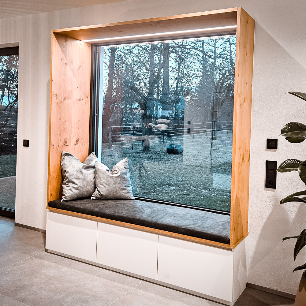 Ob mit oder ohne Unterbau, mit gemütlicher Polsterung oder stimmungsvoller Beleuchtung – entdecken Sie maßgefertigte Sitzfenster, die Architektur und Wohngefühl harmonisch verbinden.