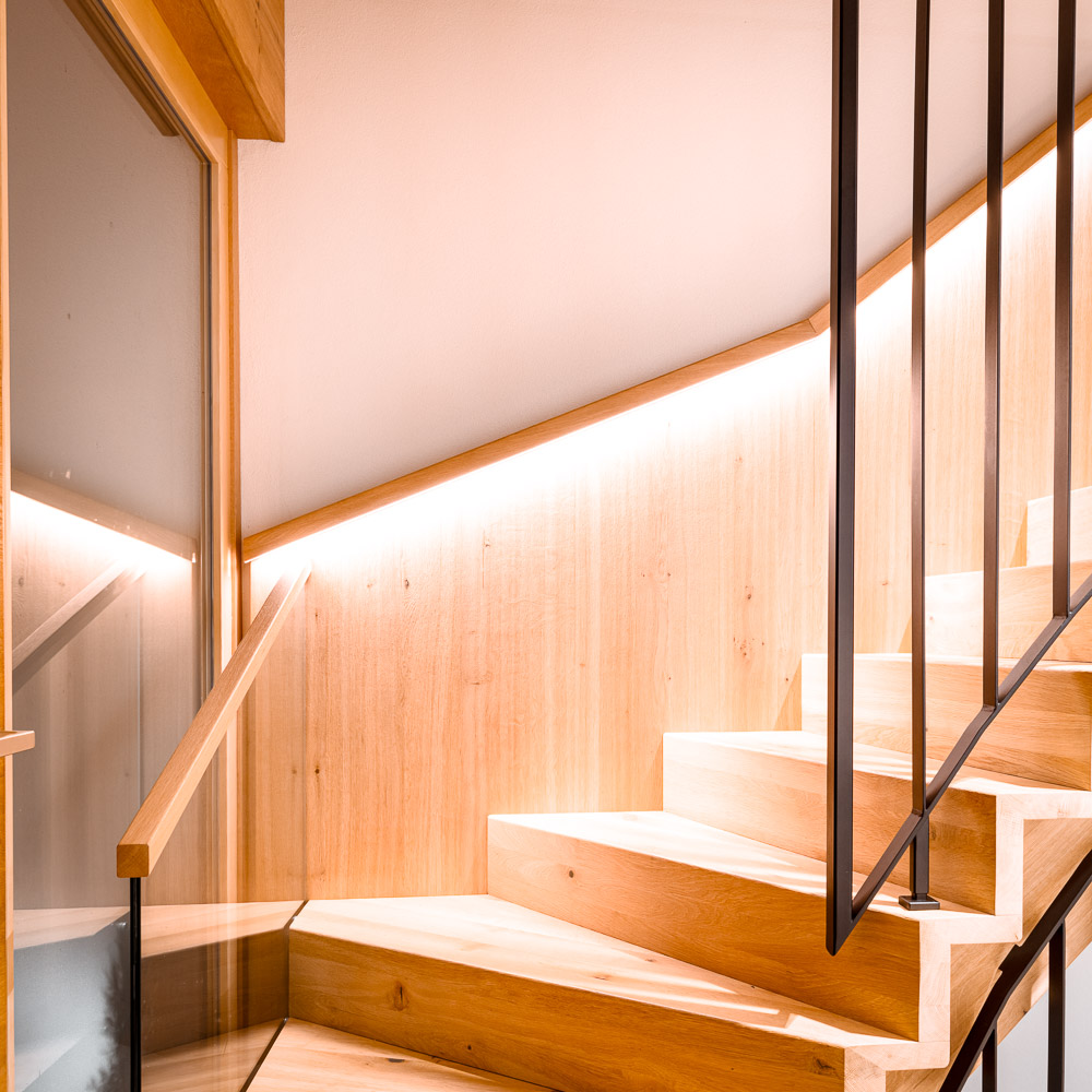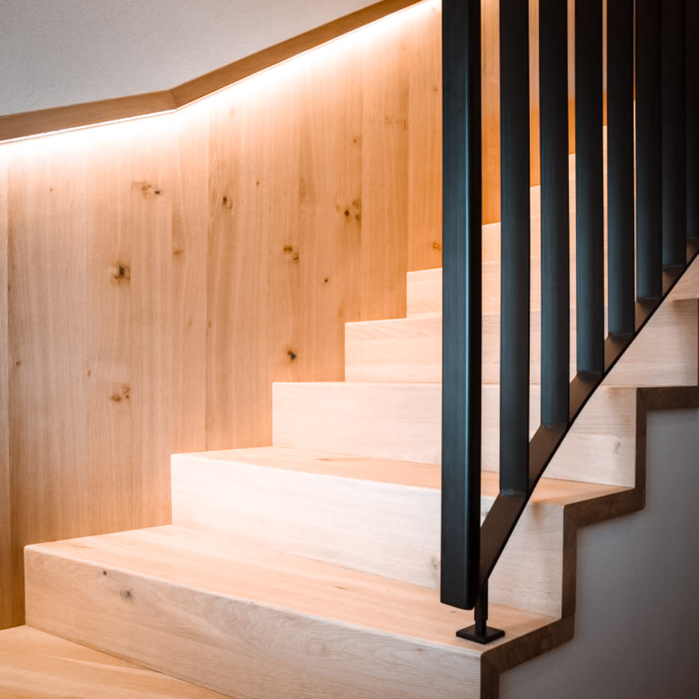 Entdecken Sie maßgefertigte Stufenlösungen mit stimmungsvollen Details wie beleuchteten Handläufen – für Treppen, die Sicherheit und Design harmonisch verbinden.