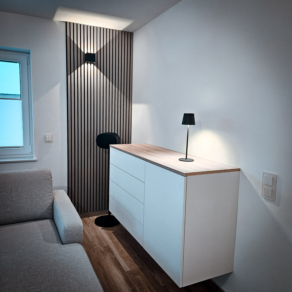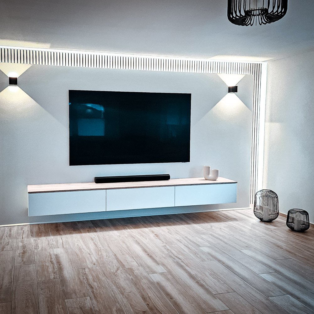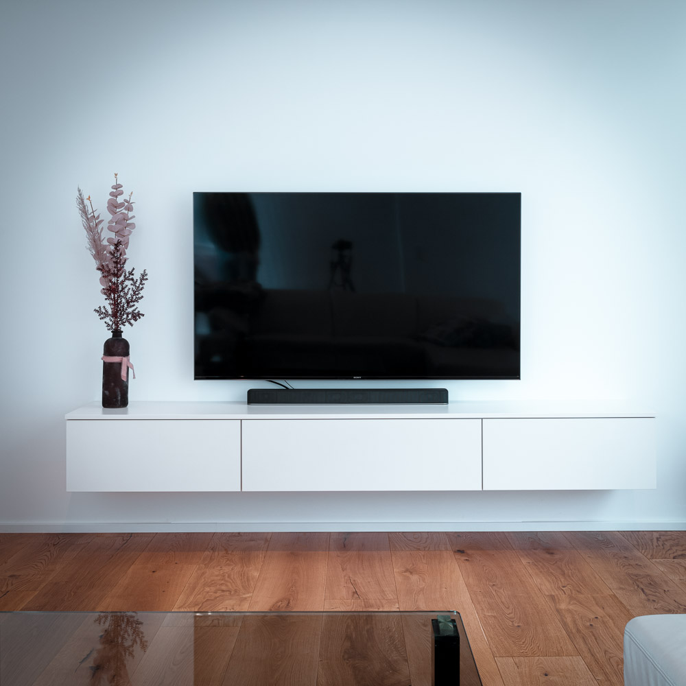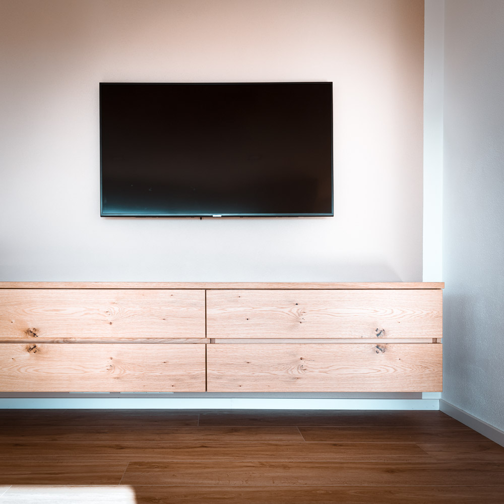 Ob Lowboard mit TV an der Wand oder auf dem Board, Schubladen und Klappen für Receiver und Co., durchsichtige oder stoffbespannte Fronten – wir gestalten Möbel, die Technik und Design harmonisch verbinden. Ergänzt durch Vitrinenschränke und flexible Fachböden entstehen Wohnzimmermöbel, die sowohl ästhetisch als auch praktisch überzeugen.